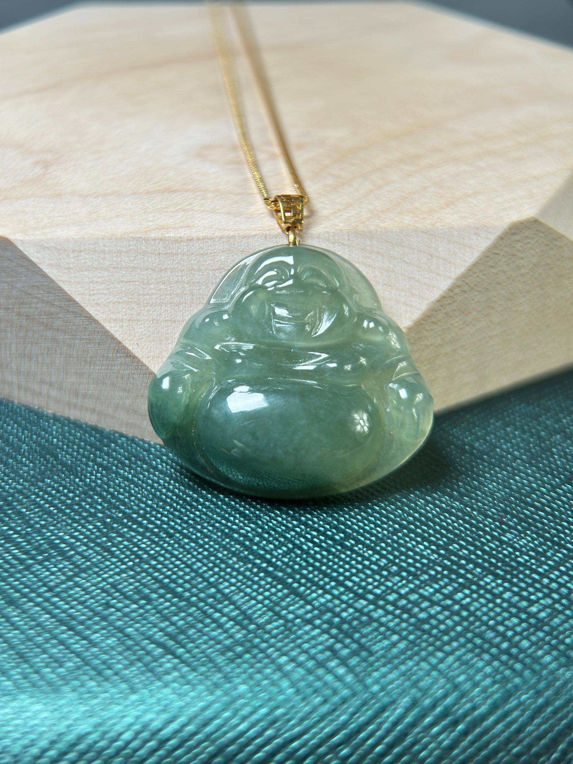 Genuine Burmese Green Jadeite Jade Happy Buddha Pendant with 18K Gold Bail