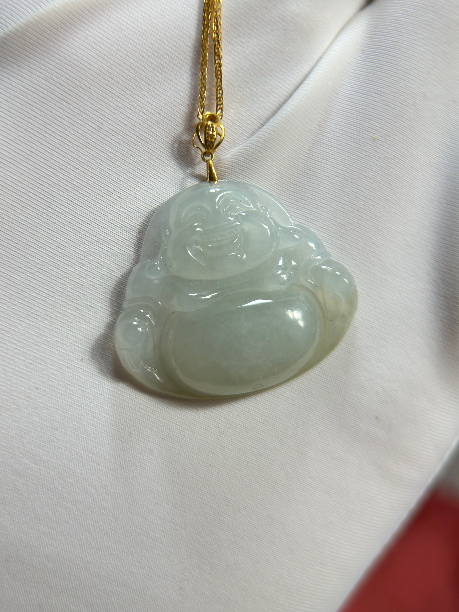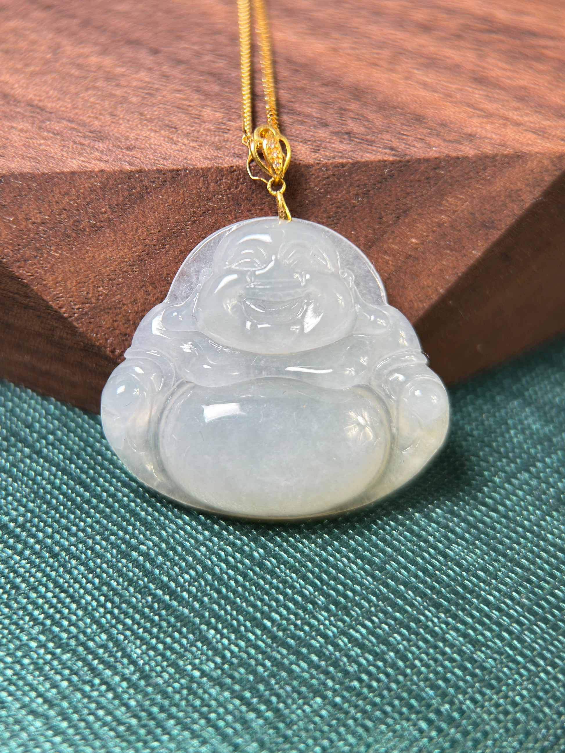 Genuine Burmese Icy Jadeite Jade Happy Buddha Pendant with 18K Gold Bail