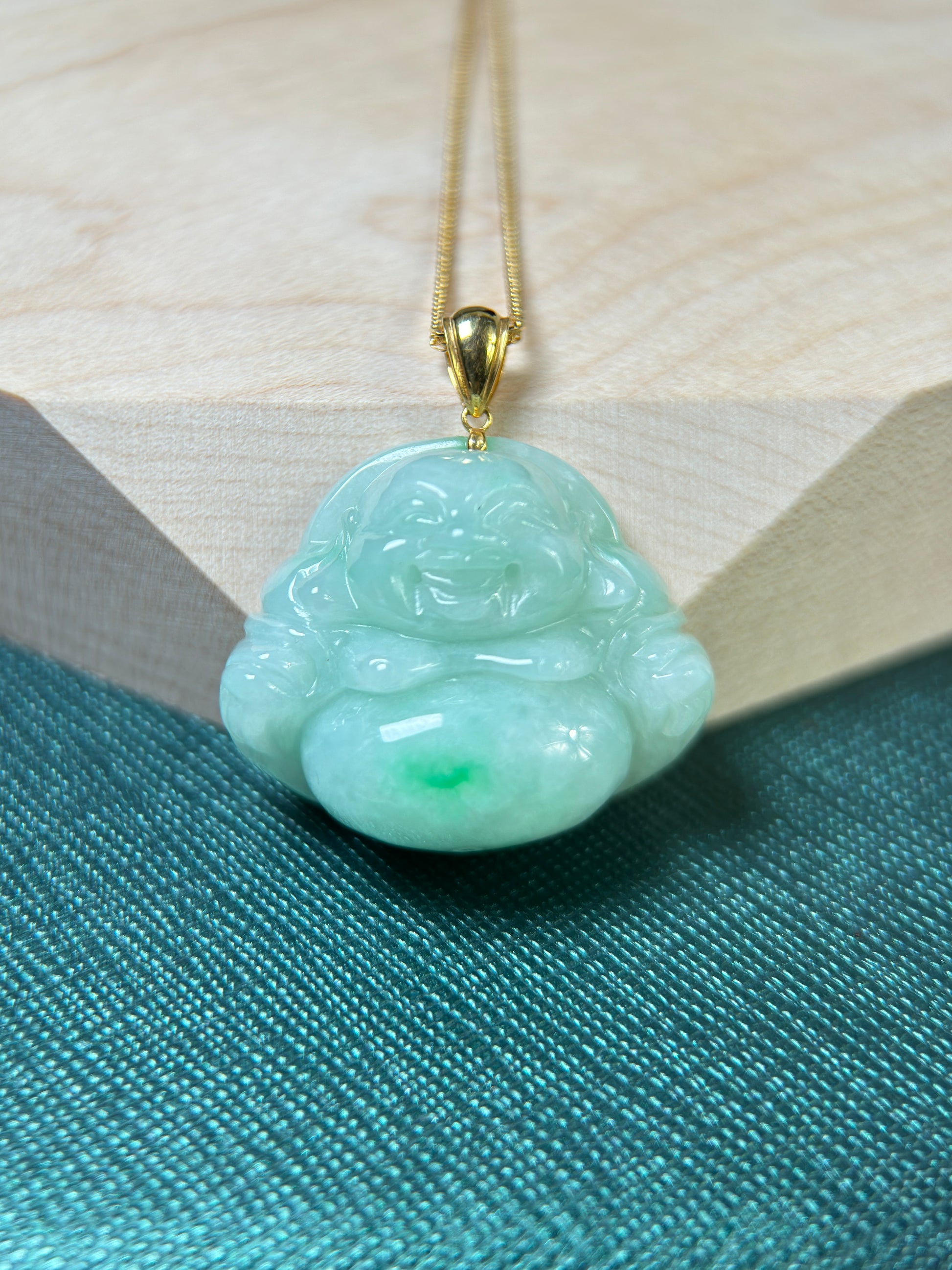 Genuine Burmese Green Jadeite Jade Happy Buddha Pendant with 18K Gold Bail