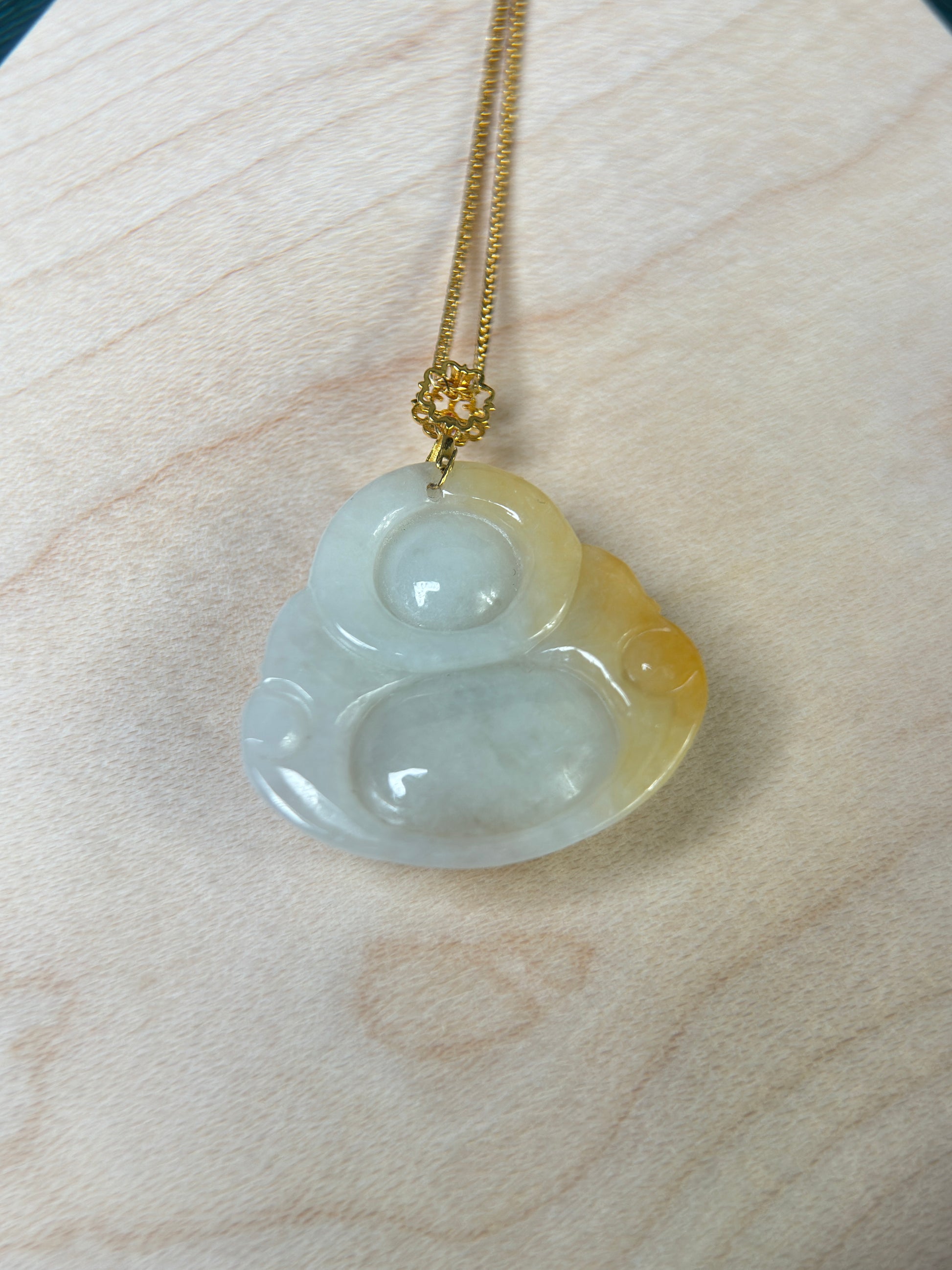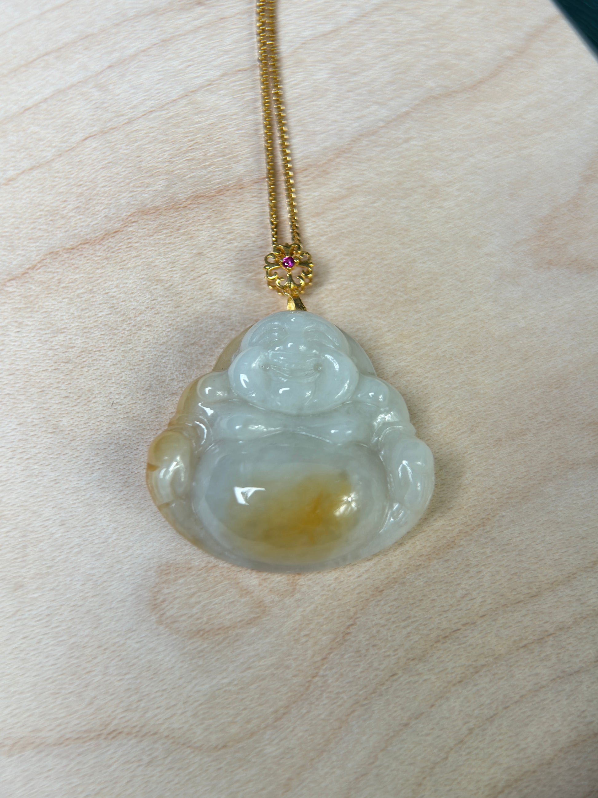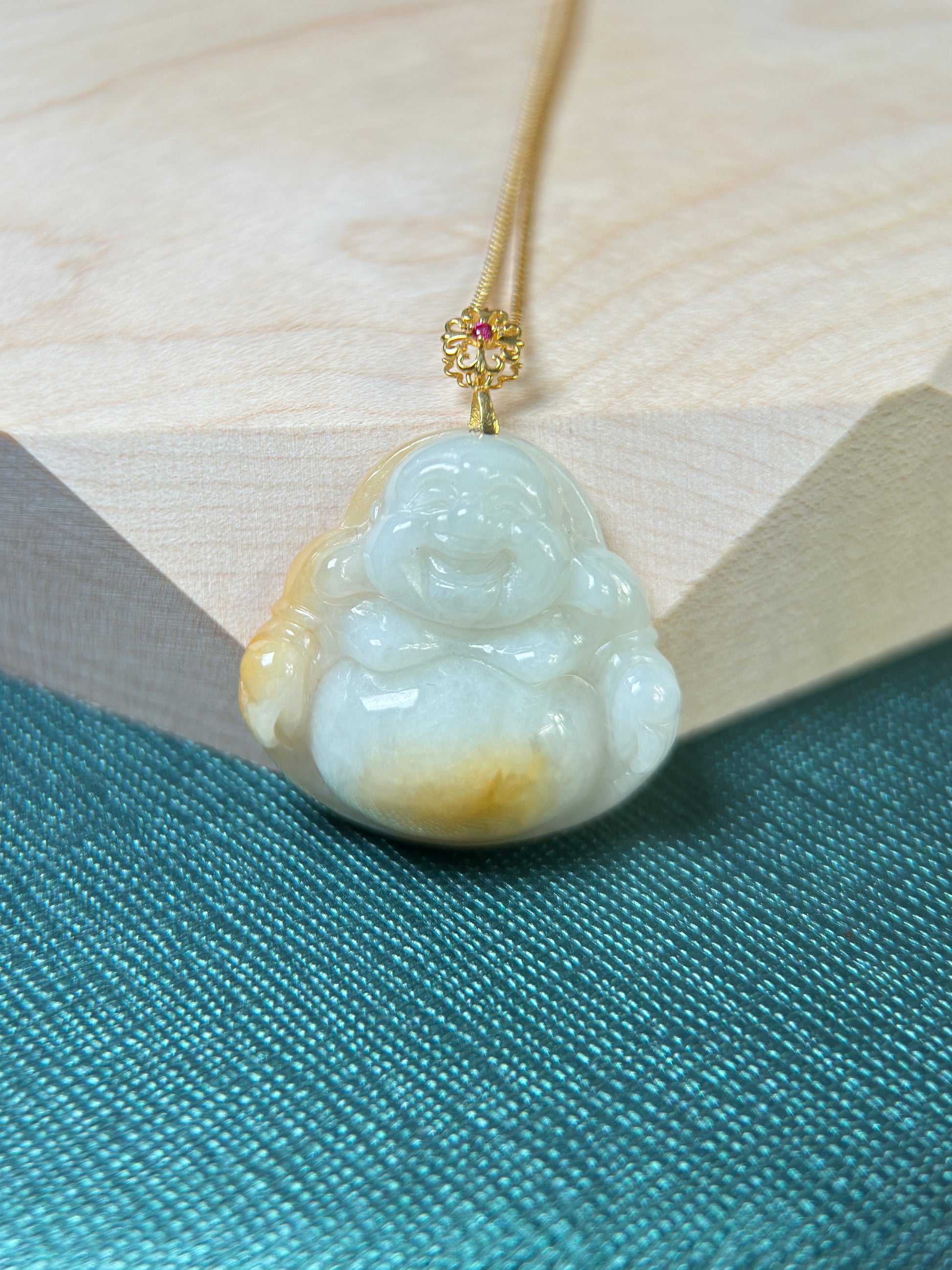 Genuine Burmese Yellow Jadeite Jade Happy Buddha Pendant with 18K Gold Bail