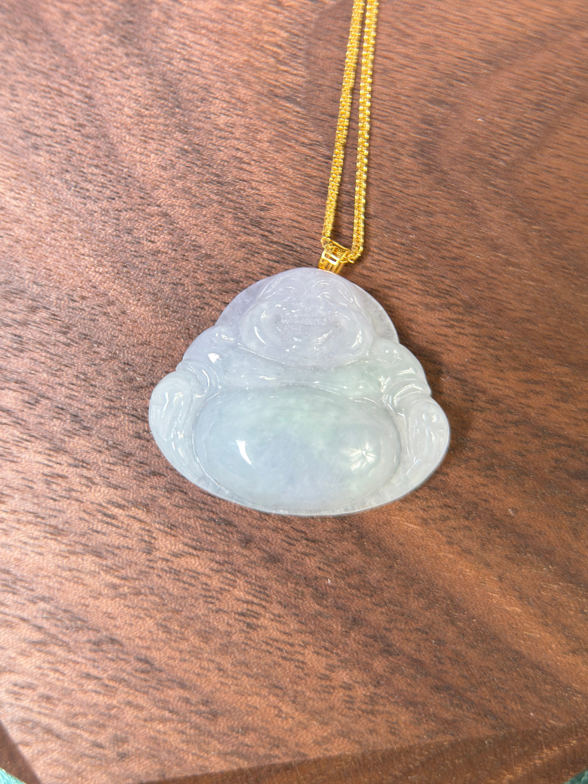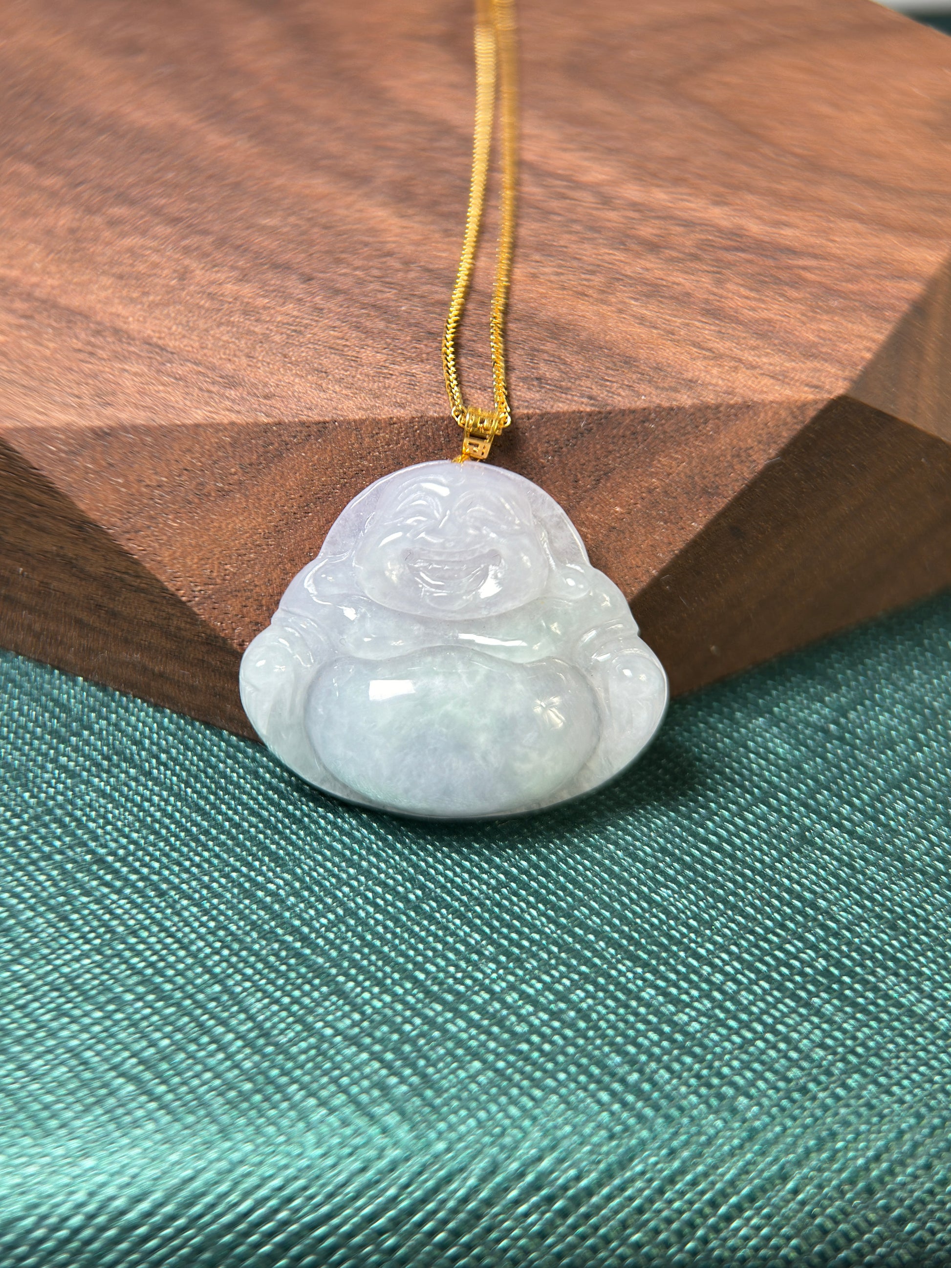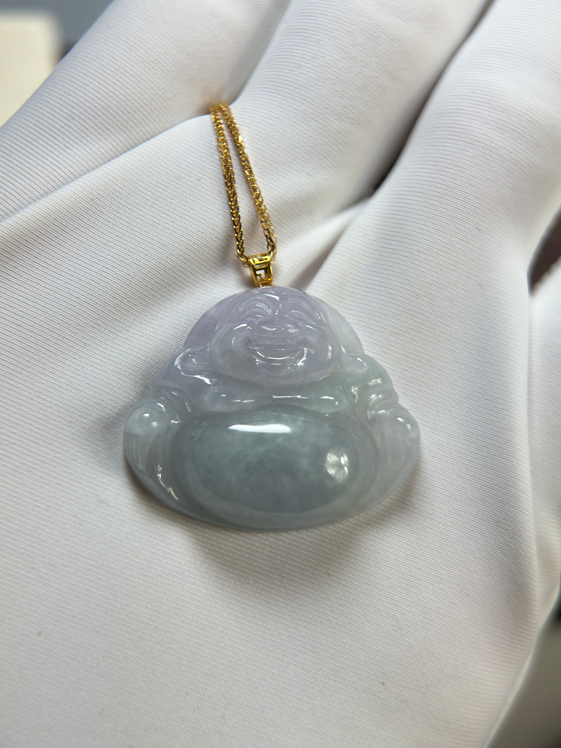 Genuine Burmese Icy Lavender Jadeite Jade Happy Buddha Pendant with 18K Gold Bail