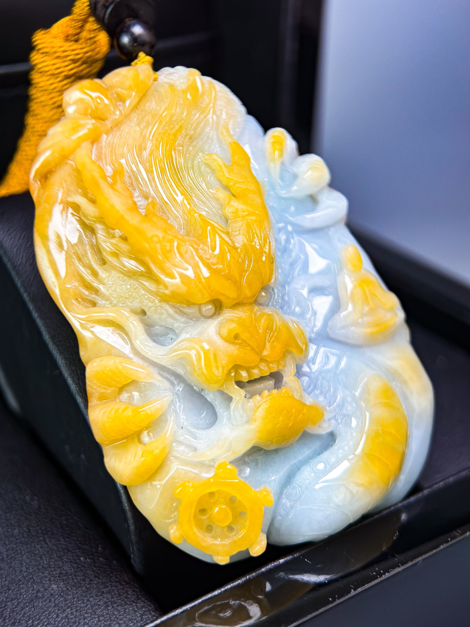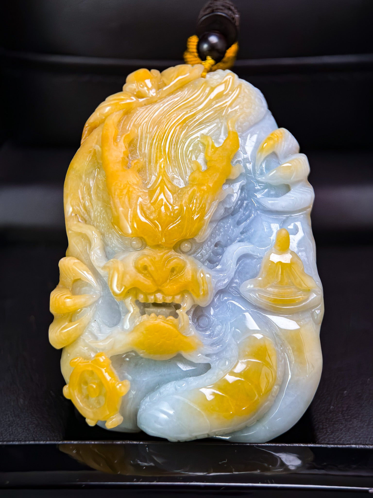 Genuine Jadeite Jade Yellow White Dragon Pendant Necklace